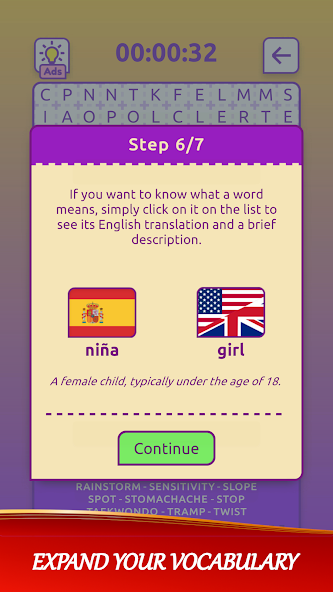 Word Search – Learn Language is a fun and educational puzzle game that helps you improve your vocabulary while having a great time. Search for hidden words in a grid of letters and connect them with a simple swipe.